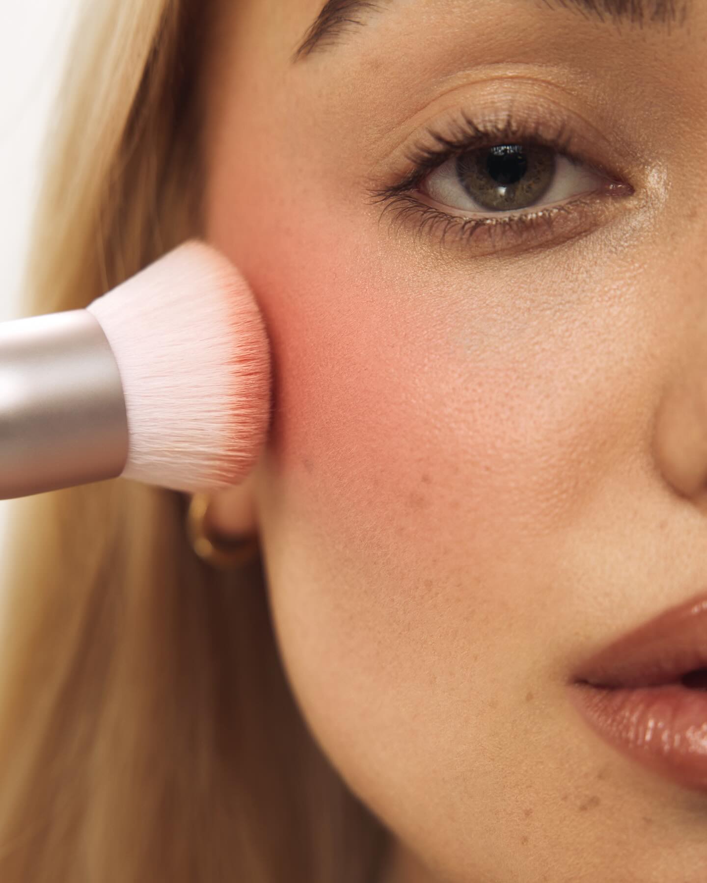 To apply blush, smile and apply the product to the apples of your cheeks, then blend it upward toward your temples. This creates a natural, lifted look. For powder blush, use a fluffy blush brush—dip the brush into the powder, tap off the excess, then apply. For cream or liquid blush, use your fingers or a makeup sponge—dot a small amount onto the apples of your cheeks, then blend quickly (these formulas dry down fast, so it’s important to blend immediately).